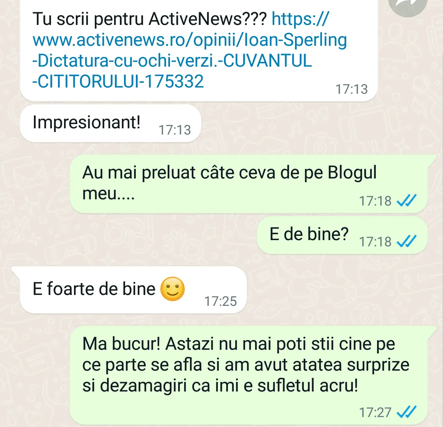 Așa am primit pe Whatsapp un link a unui articol al meu publicat de ActiveNews cu întrebarea: ” Tu scrii pentru ActiveNews???” de la un prieten, pe care nu l-am mai văzut și de care nu mai știam nimic, de f. mult timp. Trei semne de intrebare, m-am gândit că nu-i a bună! Am recunoscut spășit ca da și apoi am întrebat cu teamă ” E de bine?”