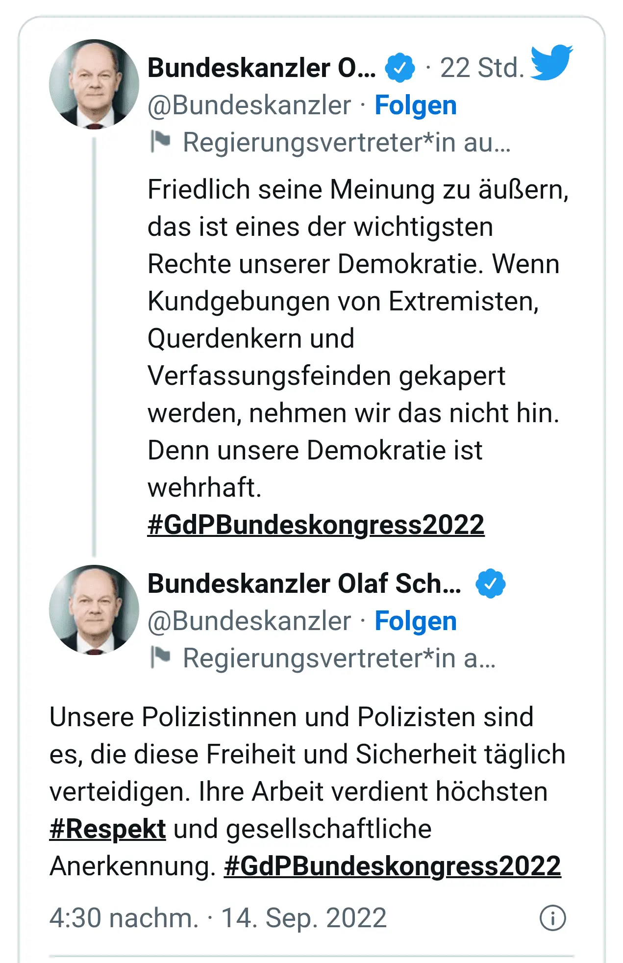 Și la sfârșit, dar desigur nu se încheie aici, Cancelarul Germaniei Olaf Scholz declară senin miercuri, pe Twitter că: „Libertatea de exprimare a opiniei este un drept democratic dar nu și pentru cei care critică regimul, împotriva cărora „democrația” știe să se apere/ împotrivească!” Si apoi urmează o „tămâiere” a poliției căreia îi datorăm respect pentru această „împotrivire„!