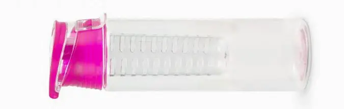 Aceasta este o sticlă pentru infuzie de fructe. Este special concepută pentru a adăuga arome naturale apei prin plasarea fructelor în compartimentul din mijloc. Acest tip de sticlă este cunoscut sub denumirea de „infuser water bottle” și este utilizată pentru a crea băuturi aromate și sănătoase fără a adăuga zahăr sau arome artificiale. Capacul roz include un compartiment detașabil unde se pun fructele, legumele sau plantele aromatice care vor infuza apa din jur.